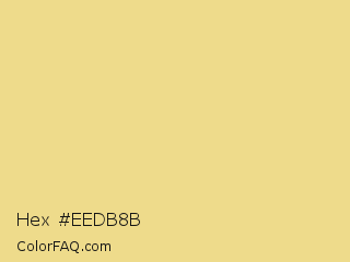 Hex #eedb8b Color is a light yellow color and the nearest color is Wild Rice #ece090. Hex code #eedb8b and RGB value is rgb(238,219,139). In RGB color space, this color is composed of 93% red, 86% green, 55% blue, In CMYK color space, this color is composed of 0% cyan, 8% magenta, 42% yellow , 7% black , In HSL color space, this color has a hue angle of 48° , 74% saturation and 74% lightness.