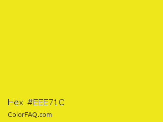 Hex #eee71c Color is a normal yellow color and the nearest color is Piss Yellow #e1e115. Hex code #eee71c and RGB value is rgb(238,231,28). In RGB color space, this color is composed of 93% red, 91% green, 11% blue, In CMYK color space, this color is composed of 0% cyan, 3% magenta, 88% yellow , 7% black , In HSL color space, this color has a hue angle of 58° , 86% saturation and 52% lightness.