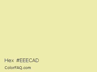 Hex #eeecad Color is a very light yellow color and the nearest color is Pale Goldenrod #eee8aa. Hex code #eeecad and RGB value is rgb(238,236,173). In RGB color space, this color is composed of 93% red, 93% green, 68% blue, In CMYK color space, this color is composed of 0% cyan, 1% magenta, 27% yellow , 7% black , In HSL color space, this color has a hue angle of 58° , 66% saturation and 81% lightness.
