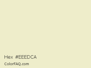 Hex #eeedca Color is a very light yellow color and the nearest color is Tahuna Sands #eef0c8. Hex code #eeedca and RGB value is rgb(238,237,202). In RGB color space, this color is composed of 93% red, 93% green, 79% blue, In CMYK color space, this color is composed of 0% cyan, 0% magenta, 15% yellow , 7% black , In HSL color space, this color has a hue angle of 58° , 51% saturation and 86% lightness.