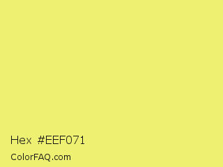 Hex #eef071 Color is a light yellow color and the nearest color is Manz #eeef78. Hex code #eef071 and RGB value is rgb(238,240,113). In RGB color space, this color is composed of 93% red, 94% green, 44% blue, In CMYK color space, this color is composed of 1% cyan, 0% magenta, 53% yellow , 6% black , In HSL color space, this color has a hue angle of 61° , 81% saturation and 69% lightness.