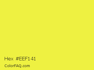 Hex #eef141 Color is a normal yellow color and the nearest color is Starship #ecf245. Hex code #eef141 and RGB value is rgb(238,241,65). In RGB color space, this color is composed of 93% red, 95% green, 25% blue, In CMYK color space, this color is composed of 1% cyan, 0% magenta, 73% yellow , 5% black , In HSL color space, this color has a hue angle of 61° , 86% saturation and 60% lightness.