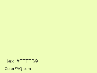 Hex #eefeb9 Color is a very light lime color and the nearest color is Australian Mint #f5ffbe. Hex code #eefeb9 and RGB value is rgb(238,254,185). In RGB color space, this color is composed of 93% red, 100% green, 73% blue, In CMYK color space, this color is composed of 6% cyan, 0% magenta, 27% yellow , 0% black , In HSL color space, this color has a hue angle of 74° , 97% saturation and 86% lightness.