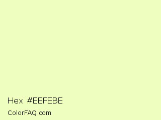 Hex #eefebe Color is a very light lime color and the nearest color is Australian Mint #f5ffbe. Hex code #eefebe and RGB value is rgb(238,254,190). In RGB color space, this color is composed of 93% red, 100% green, 75% blue, In CMYK color space, this color is composed of 6% cyan, 0% magenta, 25% yellow , 0% black , In HSL color space, this color has a hue angle of 75° , 97% saturation and 87% lightness.