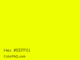 Hex #eeff01 Color is a normal yellow color and the nearest color is Lemon Lime #e3ff00. Hex code #eeff01 and RGB value is rgb(238,255,1). In RGB color space, this color is composed of 93% red, 100% green, 0% blue, In CMYK color space, this color is composed of 7% cyan, 0% magenta, 100% yellow , 0% black , In HSL color space, this color has a hue angle of 64° , 100% saturation and 50% lightness.