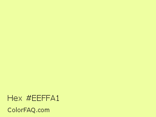 Hex #eeffa1 Color is a very light lime color and the nearest color is Jonquil #eeff9a. Hex code #eeffa1 and RGB value is rgb(238,255,161). In RGB color space, this color is composed of 93% red, 100% green, 63% blue, In CMYK color space, this color is composed of 7% cyan, 0% magenta, 37% yellow , 0% black , In HSL color space, this color has a hue angle of 71° , 100% saturation and 82% lightness.