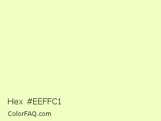 Hex #eeffc1 Color is a very light lime color and the nearest color is Chiffon #f1ffc8. Hex code #eeffc1 and RGB value is rgb(238,255,193). In RGB color space, this color is composed of 93% red, 100% green, 76% blue, In CMYK color space, this color is composed of 7% cyan, 0% magenta, 24% yellow , 0% black , In HSL color space, this color has a hue angle of 76° , 100% saturation and 88% lightness.