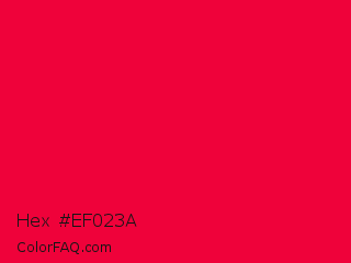 Hex #ef023a Color is a normal red color and the nearest color is Red Munsell #f2003c. Hex code #ef023a and RGB value is rgb(239,2,58). In RGB color space, this color is composed of 94% red, 1% green, 23% blue, In CMYK color space, this color is composed of 0% cyan, 99% magenta, 76% yellow , 6% black , In HSL color space, this color has a hue angle of 346° , 98% saturation and 47% lightness.