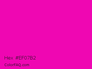 Hex #ef07b2 Color is a normal magenta color and the nearest color is Hollywood Cerise #f400a1. Hex code #ef07b2 and RGB value is rgb(239,7,178). In RGB color space, this color is composed of 94% red, 3% green, 70% blue, In CMYK color space, this color is composed of 0% cyan, 97% magenta, 26% yellow , 6% black , In HSL color space, this color has a hue angle of 316° , 94% saturation and 48% lightness.