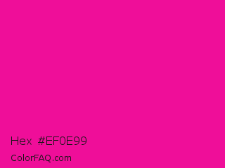 Hex #ef0e99 Color is a normal magenta color and the nearest color is Hollywood Cerise #f400a1. Hex code #ef0e99 and RGB value is rgb(239,14,153). In RGB color space, this color is composed of 94% red, 5% green, 60% blue, In CMYK color space, this color is composed of 0% cyan, 94% magenta, 36% yellow , 6% black , In HSL color space, this color has a hue angle of 323° , 89% saturation and 50% lightness.