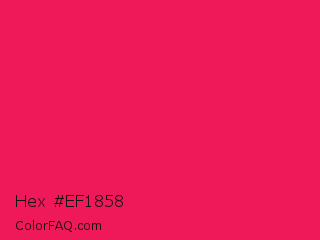 Hex #ef1858 Color is a normal rose color and the nearest color is Red Crayola #ee204d. Hex code #ef1858 and RGB value is rgb(239,24,88). In RGB color space, this color is composed of 94% red, 9% green, 35% blue, In CMYK color space, this color is composed of 0% cyan, 90% magenta, 63% yellow , 6% black , In HSL color space, this color has a hue angle of 342° , 87% saturation and 52% lightness.