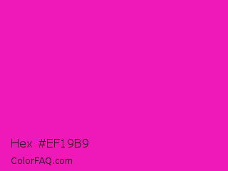 Hex #ef19b9 Color is a normal magenta color and the nearest color is Shocking Pink #fc0fc0. Hex code #ef19b9 and RGB value is rgb(239,25,185). In RGB color space, this color is composed of 94% red, 10% green, 73% blue, In CMYK color space, this color is composed of 0% cyan, 90% magenta, 23% yellow , 6% black , In HSL color space, this color has a hue angle of 315° , 87% saturation and 52% lightness.