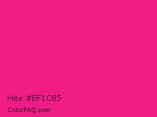 Hex #ef1c85 Color is a normal rose color and the nearest color is Barbie Pink #e0218a. Hex code #ef1c85 and RGB value is rgb(239,28,133). In RGB color space, this color is composed of 94% red, 11% green, 52% blue, In CMYK color space, this color is composed of 0% cyan, 88% magenta, 44% yellow , 6% black , In HSL color space, this color has a hue angle of 330° , 87% saturation and 52% lightness.