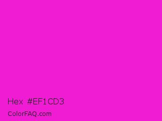 Hex #ef1cd3 Color is a normal magenta color and the nearest color is Hot Magenta #ff1dce. Hex code #ef1cd3 and RGB value is rgb(239,28,211). In RGB color space, this color is composed of 94% red, 11% green, 83% blue, In CMYK color space, this color is composed of 0% cyan, 88% magenta, 12% yellow , 6% black , In HSL color space, this color has a hue angle of 308° , 87% saturation and 52% lightness.