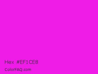 Hex #ef1ce8 Color is a normal magenta color and the nearest color is Hot Magenta #ff1dce. Hex code #ef1ce8 and RGB value is rgb(239,28,232). In RGB color space, this color is composed of 94% red, 11% green, 91% blue, In CMYK color space, this color is composed of 0% cyan, 88% magenta, 3% yellow , 6% black , In HSL color space, this color has a hue angle of 302° , 87% saturation and 52% lightness.