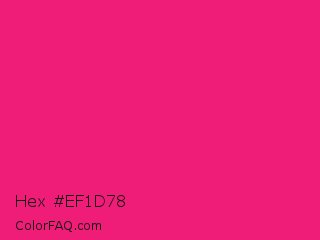 Hex #ef1d78 Color is a normal rose color and the nearest color is Razzmatazz #e3256b. Hex code #ef1d78 and RGB value is rgb(239,29,120). In RGB color space, this color is composed of 94% red, 11% green, 47% blue, In CMYK color space, this color is composed of 0% cyan, 88% magenta, 50% yellow , 6% black , In HSL color space, this color has a hue angle of 334° , 87% saturation and 53% lightness.
