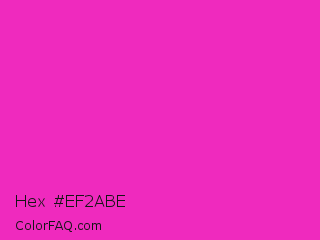 Hex #ef2abe Color is a normal magenta color and the nearest color is Razzle Dazzle Rose #ff33cc. Hex code #ef2abe and RGB value is rgb(239,42,190). In RGB color space, this color is composed of 94% red, 16% green, 75% blue, In CMYK color space, this color is composed of 0% cyan, 82% magenta, 21% yellow , 6% black , In HSL color space, this color has a hue angle of 315° , 86% saturation and 55% lightness.