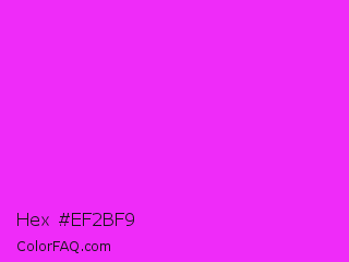 Hex #ef2bf9 Color is a normal magenta color and the nearest color is Phlox #df00ff. Hex code #ef2bf9 and RGB value is rgb(239,43,249). In RGB color space, this color is composed of 94% red, 17% green, 98% blue, In CMYK color space, this color is composed of 4% cyan, 83% magenta, 0% yellow , 2% black , In HSL color space, this color has a hue angle of 297° , 94% saturation and 57% lightness.