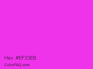 Hex #ef33eb Color is a normal magenta color and the nearest color is Razzle Dazzle Rose #ff33cc. Hex code #ef33eb and RGB value is rgb(239,51,235). In RGB color space, this color is composed of 94% red, 20% green, 92% blue, In CMYK color space, this color is composed of 0% cyan, 79% magenta, 2% yellow , 6% black , In HSL color space, this color has a hue angle of 301° , 85% saturation and 57% lightness.
