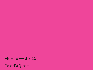 Hex #ef459a Color is a normal rose color and the nearest color is Rose Bonbon #f9429e. Hex code #ef459a and RGB value is rgb(239,69,154). In RGB color space, this color is composed of 94% red, 27% green, 60% blue, In CMYK color space, this color is composed of 0% cyan, 71% magenta, 36% yellow , 6% black , In HSL color space, this color has a hue angle of 330° , 84% saturation and 60% lightness.