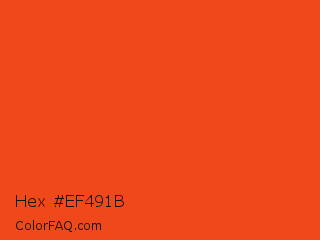 Hex #ef491b Color is a normal red color and the nearest color is Pomegranate #f34723. Hex code #ef491b and RGB value is rgb(239,73,27). In RGB color space, this color is composed of 94% red, 29% green, 11% blue, In CMYK color space, this color is composed of 0% cyan, 69% magenta, 89% yellow , 6% black , In HSL color space, this color has a hue angle of 13° , 87% saturation and 52% lightness.