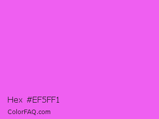 Hex #ef5ff1 Color is a light magenta color and the nearest color is Pink Flamingo Crayola #ff66ff. Hex code #ef5ff1 and RGB value is rgb(239,95,241). In RGB color space, this color is composed of 94% red, 37% green, 95% blue, In CMYK color space, this color is composed of 1% cyan, 61% magenta, 0% yellow , 5% black , In HSL color space, this color has a hue angle of 299° , 84% saturation and 66% lightness.