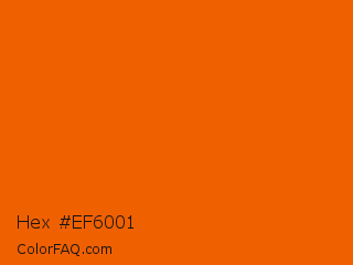Hex #ef6001 Color is a normal orange color and the nearest color is Spanish Orange #e86100. Hex code #ef6001 and RGB value is rgb(239,96,1). In RGB color space, this color is composed of 94% red, 38% green, 0% blue, In CMYK color space, this color is composed of 0% cyan, 60% magenta, 100% yellow , 6% black , In HSL color space, this color has a hue angle of 24° , 99% saturation and 47% lightness.