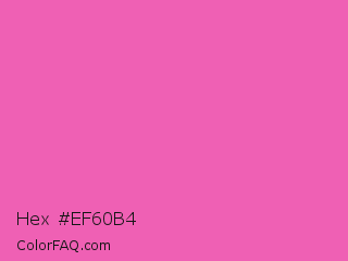 Hex #ef60b4 Color is a light magenta color and the nearest color is Hot Pink #ff69b4. Hex code #ef60b4 and RGB value is rgb(239,96,180). In RGB color space, this color is composed of 94% red, 38% green, 71% blue, In CMYK color space, this color is composed of 0% cyan, 60% magenta, 25% yellow , 6% black , In HSL color space, this color has a hue angle of 325° , 82% saturation and 66% lightness.