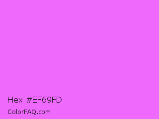 Hex #ef69fd Color is a light magenta color and the nearest color is Pink Flamingo Crayola #ff66ff. Hex code #ef69fd and RGB value is rgb(239,105,253). In RGB color space, this color is composed of 94% red, 41% green, 99% blue, In CMYK color space, this color is composed of 6% cyan, 58% magenta, 0% yellow , 1% black , In HSL color space, this color has a hue angle of 294° , 97% saturation and 70% lightness.