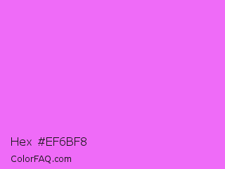 Hex #ef6bf8 Color is a light magenta color and the nearest color is Pink Flamingo #fc74fd. Hex code #ef6bf8 and RGB value is rgb(239,107,248). In RGB color space, this color is composed of 94% red, 42% green, 97% blue, In CMYK color space, this color is composed of 4% cyan, 57% magenta, 0% yellow , 3% black , In HSL color space, this color has a hue angle of 296° , 91% saturation and 70% lightness.