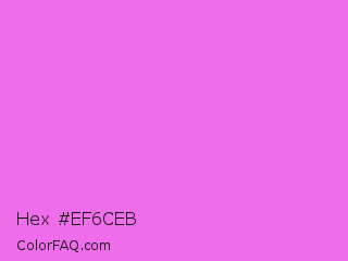 Hex #ef6ceb Color is a light magenta color and the nearest color is Lavender Magenta #ee82ee. Hex code #ef6ceb and RGB value is rgb(239,108,235). In RGB color space, this color is composed of 94% red, 42% green, 92% blue, In CMYK color space, this color is composed of 0% cyan, 55% magenta, 2% yellow , 6% black , In HSL color space, this color has a hue angle of 302° , 80% saturation and 68% lightness.