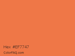 Hex #ef7747 Color is a light orange color and the nearest color is Mandarin #f37a48. Hex code #ef7747 and RGB value is rgb(239,119,71). In RGB color space, this color is composed of 94% red, 47% green, 28% blue, In CMYK color space, this color is composed of 0% cyan, 50% magenta, 70% yellow , 6% black , In HSL color space, this color has a hue angle of 17° , 84% saturation and 61% lightness.