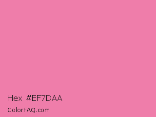 Hex #ef7daa Color is a light rose color and the nearest color is Carissma #ea88a8. Hex code #ef7daa and RGB value is rgb(239,125,170). In RGB color space, this color is composed of 94% red, 49% green, 67% blue, In CMYK color space, this color is composed of 0% cyan, 48% magenta, 29% yellow , 6% black , In HSL color space, this color has a hue angle of 336° , 78% saturation and 71% lightness.