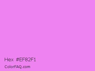 Hex #ef82f1 Color is a light magenta color and the nearest color is Lavender Magenta #ee82ee. Hex code #ef82f1 and RGB value is rgb(239,130,241). In RGB color space, this color is composed of 94% red, 51% green, 95% blue, In CMYK color space, this color is composed of 1% cyan, 46% magenta, 0% yellow , 5% black , In HSL color space, this color has a hue angle of 299° , 80% saturation and 73% lightness.
