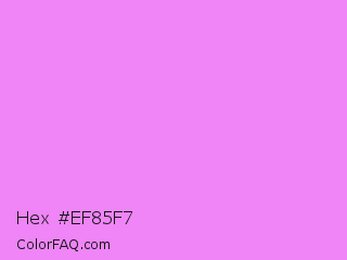 Hex #ef85f7 Color is a light magenta color and the nearest color is Lavender Magenta #ee82ee. Hex code #ef85f7 and RGB value is rgb(239,133,247). In RGB color space, this color is composed of 94% red, 52% green, 97% blue, In CMYK color space, this color is composed of 3% cyan, 46% magenta, 0% yellow , 3% black , In HSL color space, this color has a hue angle of 296° , 88% saturation and 75% lightness.