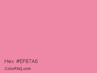 Hex #ef87a6 Color is a light rose color and the nearest color is Carissma #ea88a8. Hex code #ef87a6 and RGB value is rgb(239,135,166). In RGB color space, this color is composed of 94% red, 53% green, 65% blue, In CMYK color space, this color is composed of 0% cyan, 44% magenta, 31% yellow , 6% black , In HSL color space, this color has a hue angle of 342° , 76% saturation and 73% lightness.