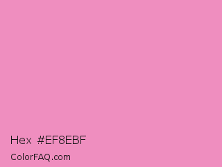 Hex #ef8ebf Color is a light rose color and the nearest color is Pastel Magenta #f49ac2. Hex code #ef8ebf and RGB value is rgb(239,142,191). In RGB color space, this color is composed of 94% red, 56% green, 75% blue, In CMYK color space, this color is composed of 0% cyan, 41% magenta, 20% yellow , 6% black , In HSL color space, this color has a hue angle of 330° , 75% saturation and 75% lightness.