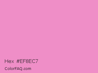 Hex #ef8ec7 Color is a light magenta color and the nearest color is Pastel Magenta #f49ac2. Hex code #ef8ec7 and RGB value is rgb(239,142,199). In RGB color space, this color is composed of 94% red, 56% green, 78% blue, In CMYK color space, this color is composed of 0% cyan, 41% magenta, 17% yellow , 6% black , In HSL color space, this color has a hue angle of 325° , 75% saturation and 75% lightness.