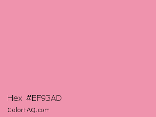Hex #ef93ad Color is a light rose color and the nearest color is Mauvelous #f091a9. Hex code #ef93ad and RGB value is rgb(239,147,173). In RGB color space, this color is composed of 94% red, 58% green, 68% blue, In CMYK color space, this color is composed of 0% cyan, 38% magenta, 28% yellow , 6% black , In HSL color space, this color has a hue angle of 343° , 74% saturation and 76% lightness.