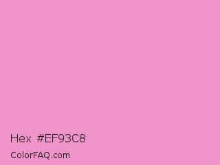 Hex #ef93c8 Color is a light magenta color and the nearest color is Pastel Magenta #f49ac2. Hex code #ef93c8 and RGB value is rgb(239,147,200). In RGB color space, this color is composed of 94% red, 58% green, 78% blue, In CMYK color space, this color is composed of 0% cyan, 38% magenta, 16% yellow , 6% black , In HSL color space, this color has a hue angle of 325° , 74% saturation and 76% lightness.