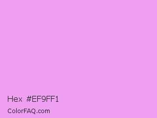 Hex #ef9ff1 Color is a light magenta color and the nearest color is Rich Brilliant Lavender #f1a7fe. Hex code #ef9ff1 and RGB value is rgb(239,159,241). In RGB color space, this color is composed of 94% red, 62% green, 95% blue, In CMYK color space, this color is composed of 1% cyan, 34% magenta, 0% yellow , 5% black , In HSL color space, this color has a hue angle of 299° , 75% saturation and 78% lightness.