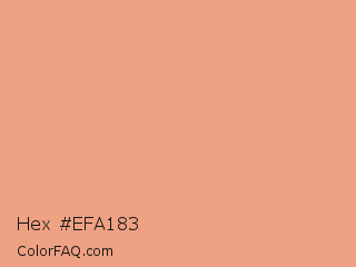 Hex #efa183 Color is a light orange color and the nearest color is Tonys Pink #e79f8c. Hex code #efa183 and RGB value is rgb(239,161,131). In RGB color space, this color is composed of 94% red, 63% green, 51% blue, In CMYK color space, this color is composed of 0% cyan, 33% magenta, 45% yellow , 6% black , In HSL color space, this color has a hue angle of 17° , 77% saturation and 73% lightness.