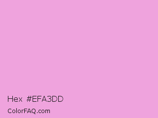 Hex #efa3dd Color is a light magenta color and the nearest color is Light Orchid #e6a8d7. Hex code #efa3dd and RGB value is rgb(239,163,221). In RGB color space, this color is composed of 94% red, 64% green, 87% blue, In CMYK color space, this color is composed of 0% cyan, 32% magenta, 8% yellow , 6% black , In HSL color space, this color has a hue angle of 314° , 70% saturation and 79% lightness.