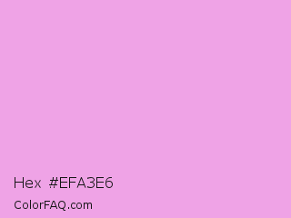 Hex #efa3e6 Color is a light magenta color and the nearest color is Lavender Rose #fba0e3. Hex code #efa3e6 and RGB value is rgb(239,163,230). In RGB color space, this color is composed of 94% red, 64% green, 90% blue, In CMYK color space, this color is composed of 0% cyan, 32% magenta, 4% yellow , 6% black , In HSL color space, this color has a hue angle of 307° , 70% saturation and 79% lightness.