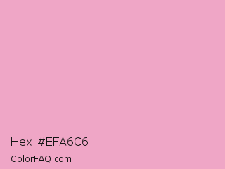 Hex #efa6c6 Color is a light rose color and the nearest color is Illusion #f6a4c9. Hex code #efa6c6 and RGB value is rgb(239,166,198). In RGB color space, this color is composed of 94% red, 65% green, 78% blue, In CMYK color space, this color is composed of 0% cyan, 31% magenta, 17% yellow , 6% black , In HSL color space, this color has a hue angle of 334° , 70% saturation and 79% lightness.