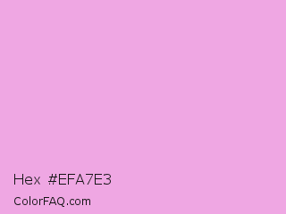 Hex #efa7e3 Color is a light magenta color and the nearest color is Lavender Rose #fba0e3. Hex code #efa7e3 and RGB value is rgb(239,167,227). In RGB color space, this color is composed of 94% red, 65% green, 89% blue, In CMYK color space, this color is composed of 0% cyan, 30% magenta, 5% yellow , 6% black , In HSL color space, this color has a hue angle of 310° , 69% saturation and 80% lightness.