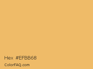 Hex #efbb68 Color is a light orange color and the nearest color is Rajah #f7b668. Hex code #efbb68 and RGB value is rgb(239,187,104). In RGB color space, this color is composed of 94% red, 73% green, 41% blue, In CMYK color space, this color is composed of 0% cyan, 22% magenta, 56% yellow , 6% black , In HSL color space, this color has a hue angle of 37° , 81% saturation and 67% lightness.