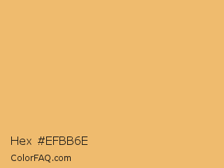 Hex #efbb6e Color is a light orange color and the nearest color is Rajah #f7b668. Hex code #efbb6e and RGB value is rgb(239,187,110). In RGB color space, this color is composed of 94% red, 73% green, 43% blue, In CMYK color space, this color is composed of 0% cyan, 22% magenta, 54% yellow , 6% black , In HSL color space, this color has a hue angle of 36° , 80% saturation and 68% lightness.