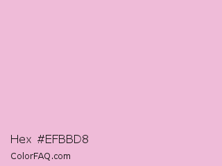 Hex #efbbd8 Color is a very light magenta color and the nearest color is Orchid Pink #f2bdcd. Hex code #efbbd8 and RGB value is rgb(239,187,216). In RGB color space, this color is composed of 94% red, 73% green, 85% blue, In CMYK color space, this color is composed of 0% cyan, 22% magenta, 10% yellow , 6% black , In HSL color space, this color has a hue angle of 327° , 62% saturation and 84% lightness.