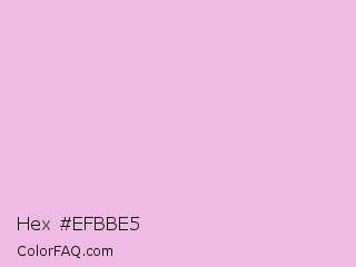 Hex #efbbe5 Color is a very light magenta color and the nearest color is Chantilly #f8c3df. Hex code #efbbe5 and RGB value is rgb(239,187,229). In RGB color space, this color is composed of 94% red, 73% green, 90% blue, In CMYK color space, this color is composed of 0% cyan, 22% magenta, 4% yellow , 6% black , In HSL color space, this color has a hue angle of 312° , 62% saturation and 84% lightness.